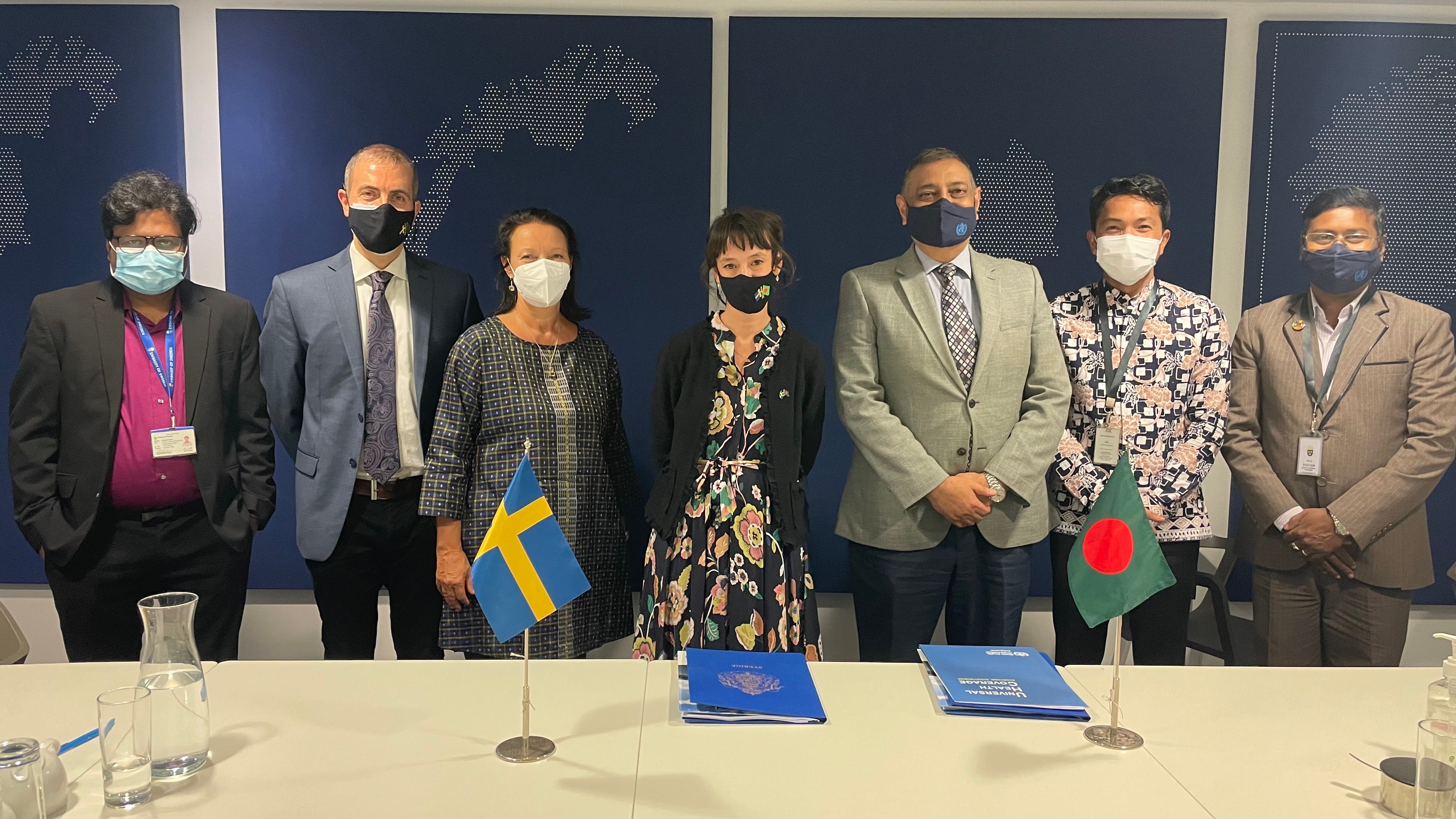 Dhaka, 14 December 2021 – The Government of Sweden supports Bangladesh in achieving the Sustainable Development Goals by channelling 76 000 000 SEK (8 500 000 USD) to WHO Bangladesh. Through the project “Strengthening the Health System in Bangladesh”, the partnership between the Government of Sweden and WHO Bangladesh will invigorate the national health financing to amplify the country’s capacity for detection and containment of antimicrobial resistance, improve mental health care, uphold the quality of health services in Cox’s Bazar district, and ultimately reach Universal Health Coverage.