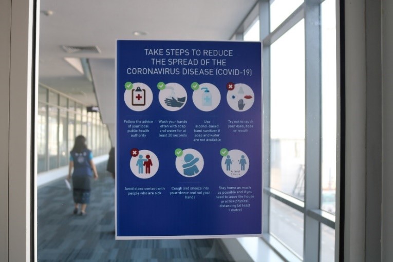 20201120-covid-19-air-travel-posters Once the passengers get off the plane, there are posters in the terminal to remind passengers on taking steps to protect themselves to reduce the spread of COVID-19.