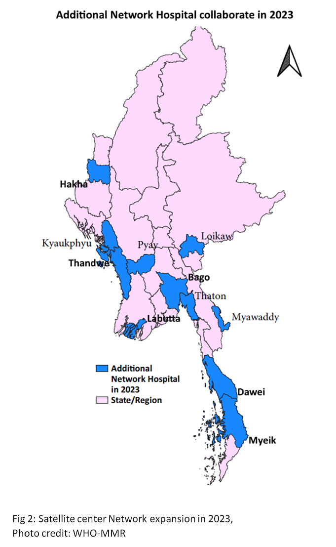 Yangon Children’s Hospital was nominated by the Ministry of Health to participate in SEAR-CCN and lead the change working along the global initiative. Yangon Children’s Hospital actively participated in the network activities and increased collaboration with fellow institutions. One such collaboration involved that with Kati Children’s Hospital in Nepal, by way of which the two hospitals shared the experiences of leading similar initiatives in similar circumstances benefiting both. GICC continued support to the Myanmar initiative. The number of satellite center network hospitals increased from 17 in 2019 to 41 in 2023. Figure 1 & 2 show network hospitals identified in 2019 and additional network hospitals collaborating in 2023 respectively.