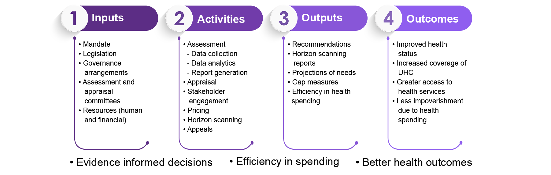 There are several useful visuals in this report, however two that are worth highlighting are a logical framework for HTA mechanisms that shows how the different inputs and activities of HTA link to the outcomes and outputs and a graphic showing how mandates for HTA can potentially change as country health systems progress. The latter shows how in fragile states the mandate of HTA can be for defining essential services lists and responding to emergencies while at the later stages for many high-income countries the mandate is for marginal analyses.